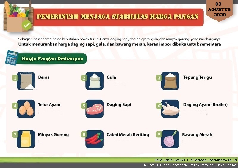 Harga Pangan Strategis Minggu I – Senin, 3 Agustus 2020 Berikut Data dari bidang Distribusi dan Cadangan Pangan Dinas Ketahanan Pangan Provinsi Jawa Tengah berupa Daftar Harga Pangan Strategis bulan Agustus 2020. Download