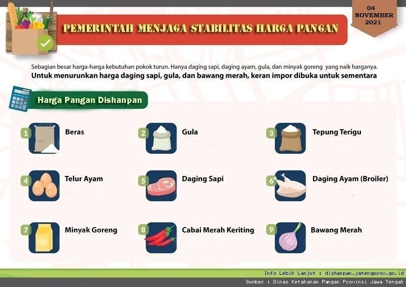 Harga Pangan Strategis Minggu I – Kamis, 04 November 2021 Berikut Data dari bidang Distribusi dan Cadangan Pangan Dinas Ketahanan Pangan Provinsi Jawa Tengah berupa Daftar Harga Pangan Strategis Bulan Oktober 2021. Download